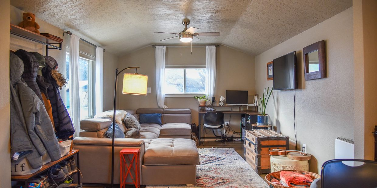 River Rider Description: Walk into our foyer. Leading to your left is the door to the single car garage, semi fenced yard which offers a great gathering place around the wood burning fire pit overlooking the Red River. Also on this ground level access is the laundry area complete with a full sized washer/dryer. Continue up the stairs to the middle story and be welcomed into the newly updated open concept living room with private North facing balcony doors, foldout sofa, wood burning fireplace, flat screen TV, spacious dining area, half bath and the completely updated kitchen housing new stainless steel appliances and sleek Formica style counter tops. The larger bedroom ensuite houses a Queen sized bed and a twin daybed with a trundle, flat screen TV, private bathroom with a tub/shower combo and a private East facing balcony looking towards the Red River Ski Area, river, and the Carson National Forest. The Primary bedroom features it's own bathroom with a tub/shower combo, a king sized bed, and it's own private North facing balcony towards Main Street and the river...